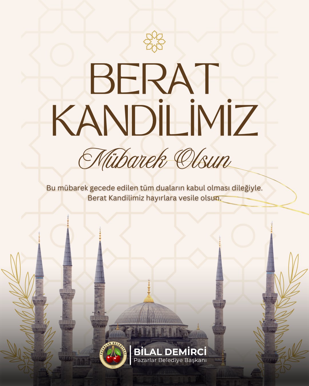 Berat Kandilimiz Mübarek Olsun Ramazan ayının müjdecisi olan bu mübarek gecede edilen tüm duaların kabul olmasını temenni ediyor; Pazarlar Belediyesi olarak başta hemşehrilerimiz olmak üzere tüm İslam âleminin kandilini kutluyoruz. 🤲